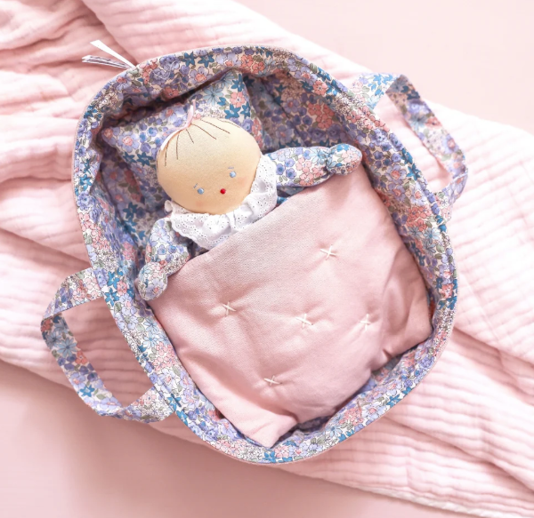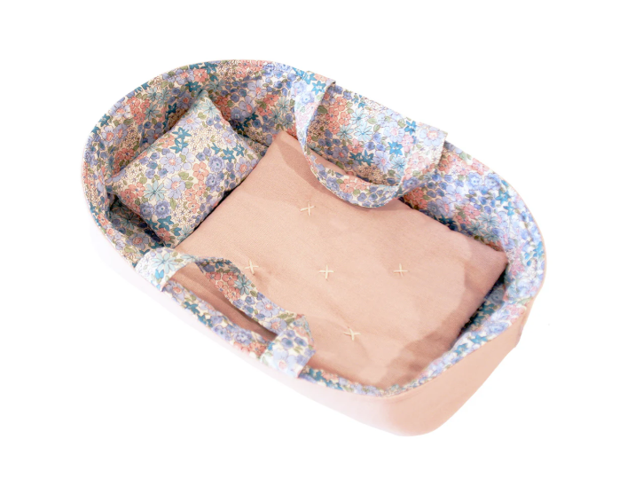 Tuck your little doll in for the sweetest dreams with our Reversible Fabric Doll Carrier Set, the perfect home for playtime snuggles and make-believe naps! Crafted with love and care, this darling basket comes complete with a soft floral pillow and a mini quilt, ready to keep your baby doll cozy and content. Perfect for your mini doll or favorite stuffed animal.