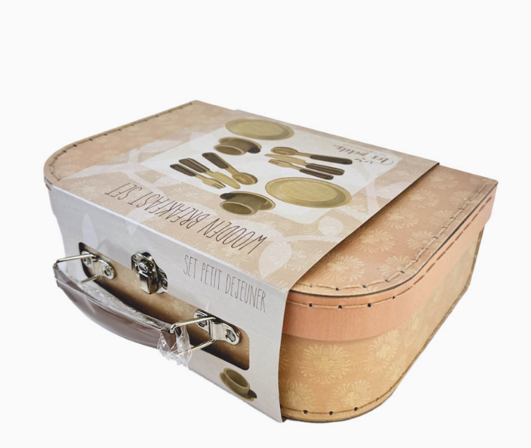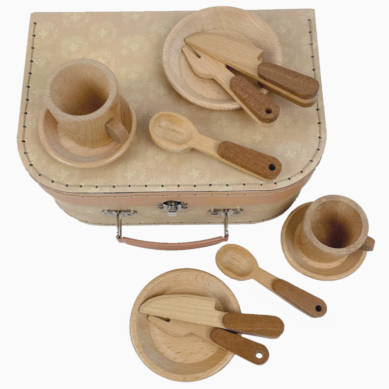Good Morning! Everything you need to prepare a lovely breakfast is included in this adorable Breakfast Set: 2 cups and saucers, 2 plates and 2 sets of cutlery. All made of beech wood. Stored in a sturdy, beautiful suitcase.
