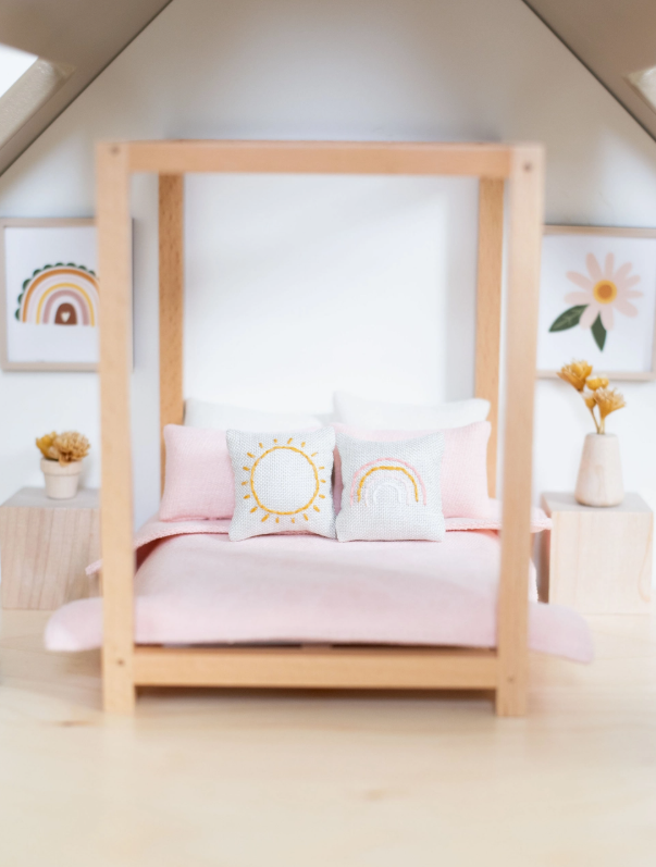 A bed that makes a statement! This double four poster bed includes a mattress so it's ready for your miniatures into their slumber. Pair this with our double bedding sets and you have a bed fit for a king or queen! Bed linens sold separately.