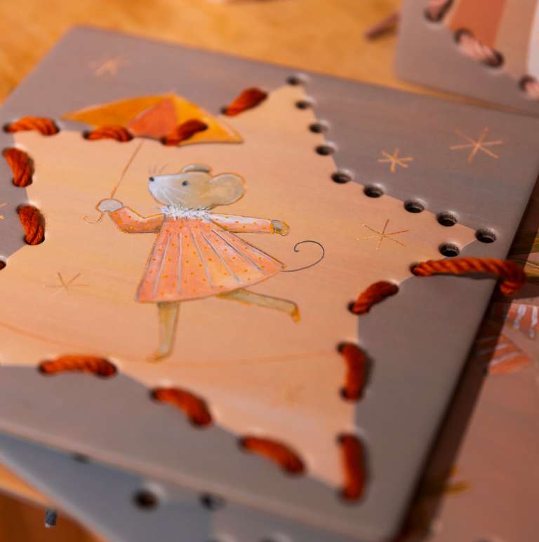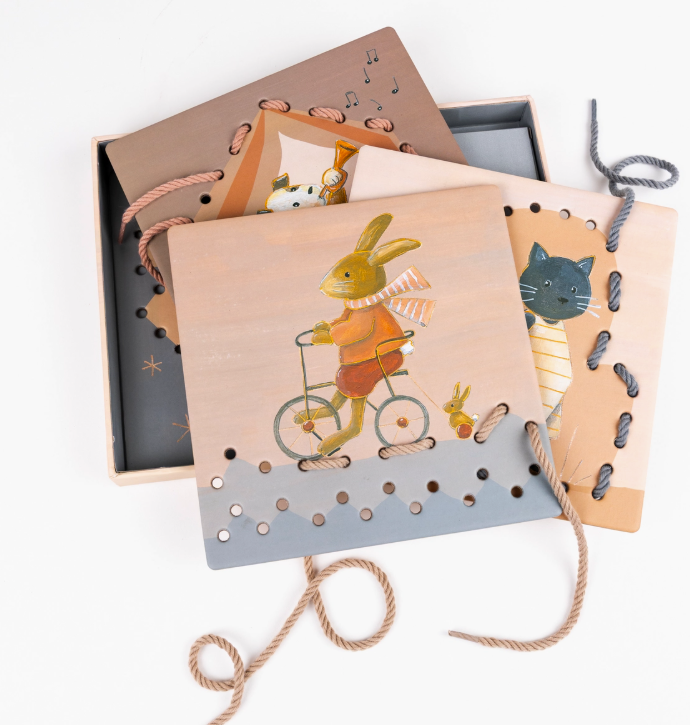 Watch little ones light up as they thread soft cotton through gentle holes and watch whimsical animal friends come to life! A cheerful bear sparkles with bunting, a curious rabbit pedals by on two wheels—each card tells its own magical story.