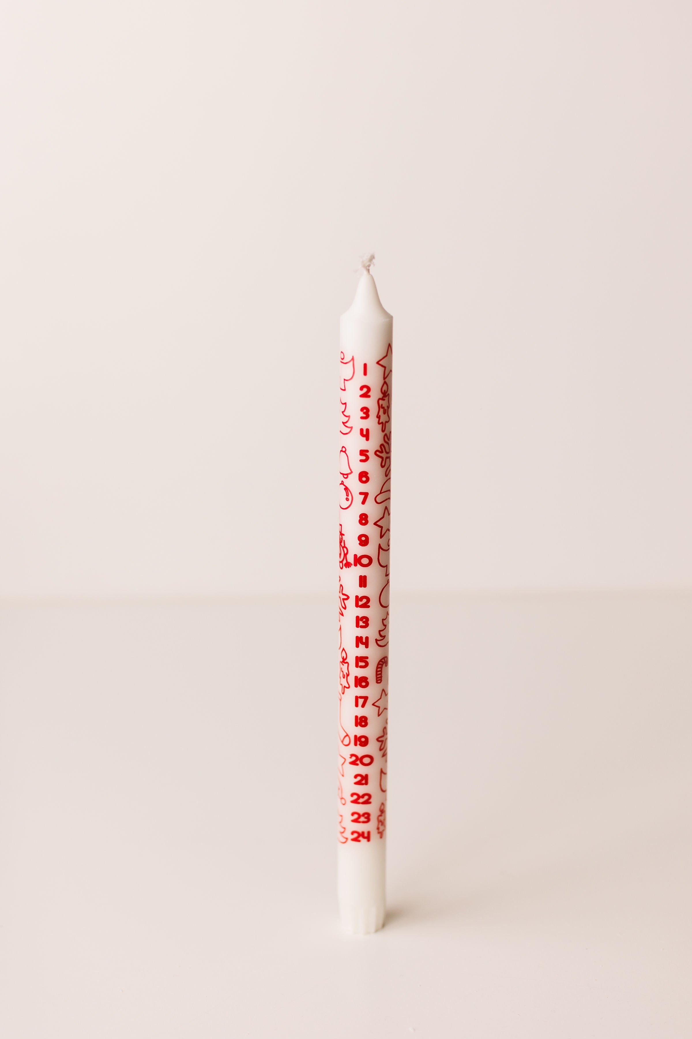 A wonderful way for your family to count down the days until Christmas! The white candle has a printed red design of holiday images and the numbers 1 to 24 for counting down the days until Christmas. A perfect family tradition.