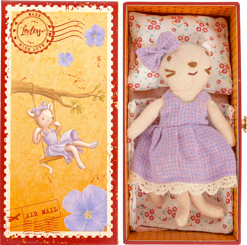 She arrives nestled in a vintage-style stamp holder box, trimmed like a postcard and adorned with air mail marks, soft florals, and a dreamy swing scene. Inside, you'll find a stack of charming bedding - perfect for imaginary naps mid-flight.