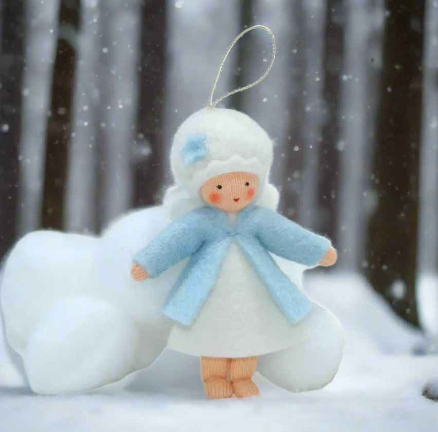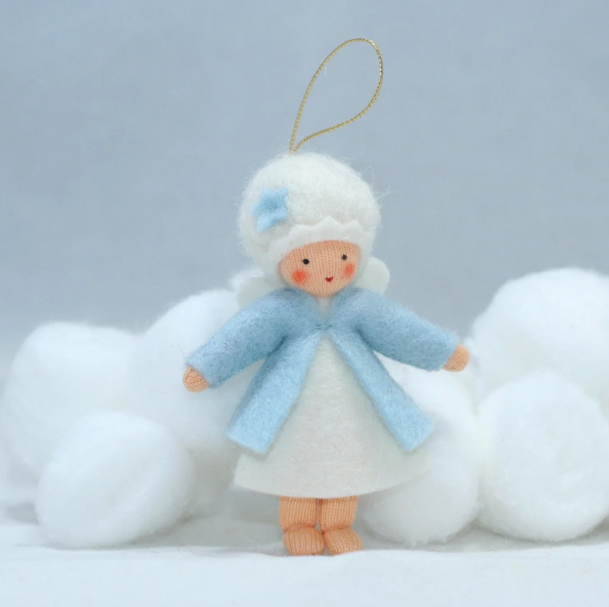 Winter Pixie Felt Doll is dressed in her white gown, ice blue jacket and matching bonnet and wings. Hanging doll with poseable arms.