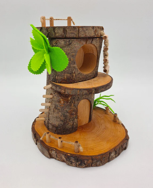Our wooden Tree Cave is made from Linseed oiled Alder wood with a piece of leather.
